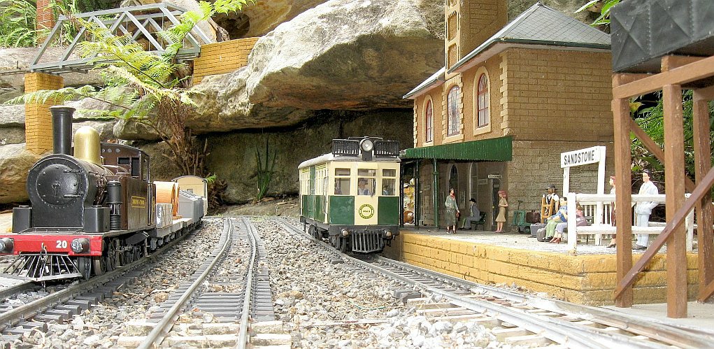 (7) The old Sydney tram and trailer approach an old version of Sandstone station.