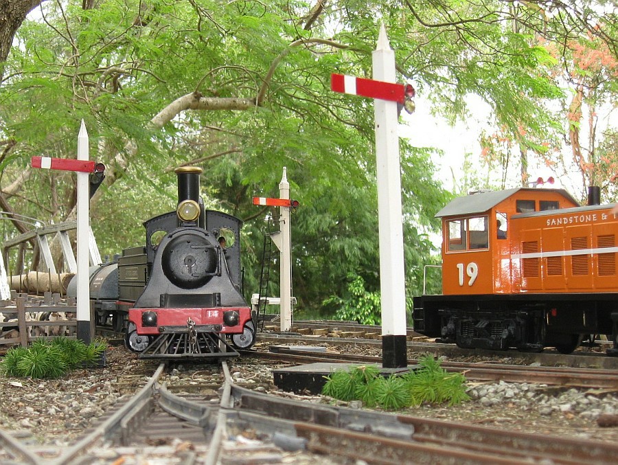 (8) Loco #14 approaches Melaleuca station, while #19 awaits a clear road.