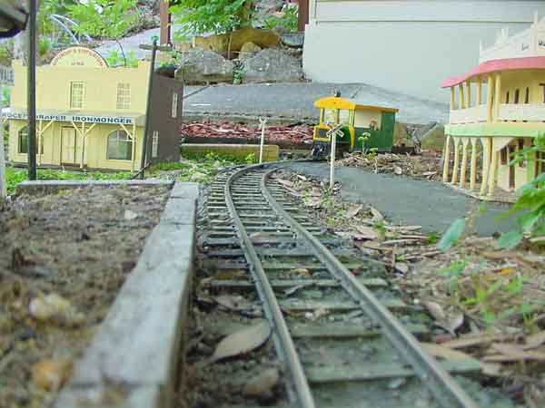 (3) The deserted street and station of Lilyvale greet the early morning railmotor as seen from the station platform (in 2003). This is the only 'town' on the S&TR and only has the Hunter's Railway Hotel, shop and a house for the SM. Many more building have been added and the station platform extended.