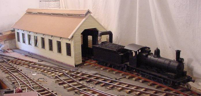 (5) The only building at Termite so far is the engine shed. Here the 19 class is taking a drink. The shed is mad from individual balsa strips glued over a ply shell. The internal framing is complete too. Windows are computer printed on clear 'overhead projector' sheets.