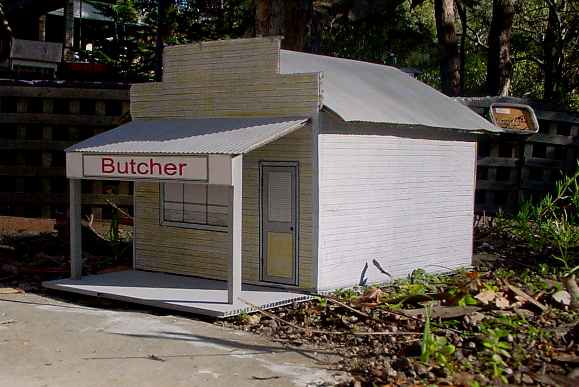 (7) To 'populate' the township of Ti-tree I will need quite a few buildings. Until I can build good models, I'm experimenting with some rough cardboard mock-ups. This one is a Butchers shop and is made from a 4 litre wine cask, with extra cardboard for the roof.