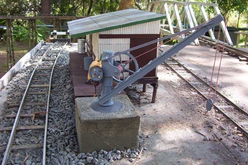 (12) Melaleuca goods shed is made from plywood covered in corrugated plastic sheeting> The crane is scratchbuilt from styrene and old gears, and it works.