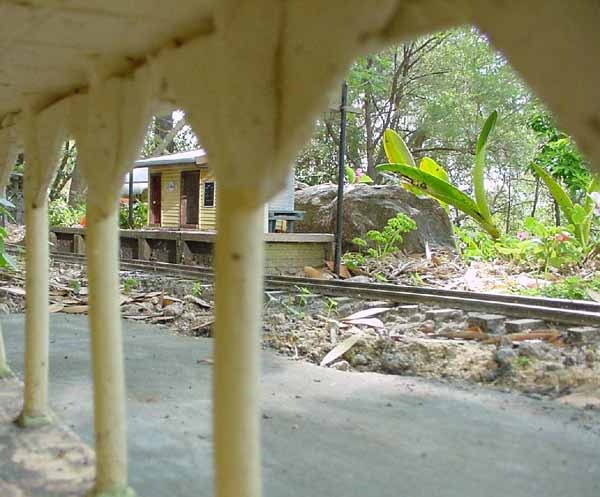 (8) Melaleuca Station Master's house is made from styrene sheet over 3-ply wood, with corrugated drink cans for the roof. Note the ant caps on the stumps and curtains.