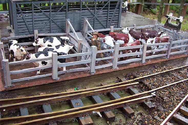 (10) The stockyards at Melaleuca are made from split oregon timber. Cows from $2 shop. A recording of moo-ing cows plays to add 'atmosphere'.