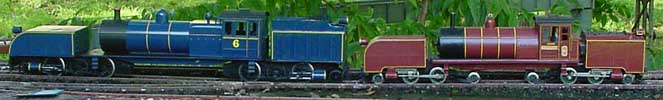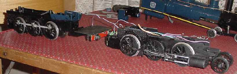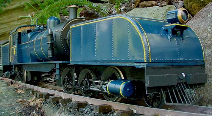 So with another 4-6-0 and it, I've created a 2-6-0 + 0-6-2 Garratt loosely based on the Victorian narrow gauge type, but with a 'curvy' front which I like. It is battery powered with a 7 Ah, 12V battery in the rear tank and the radio control and two sound systems in the boiler. Converting the 4-6-0 to a 2-6-0 means the cylinders had to be moved back and the drive rods shortened.