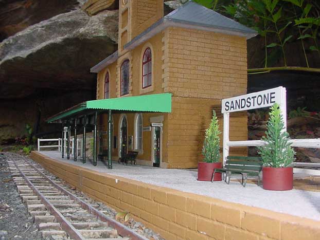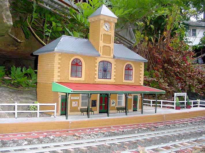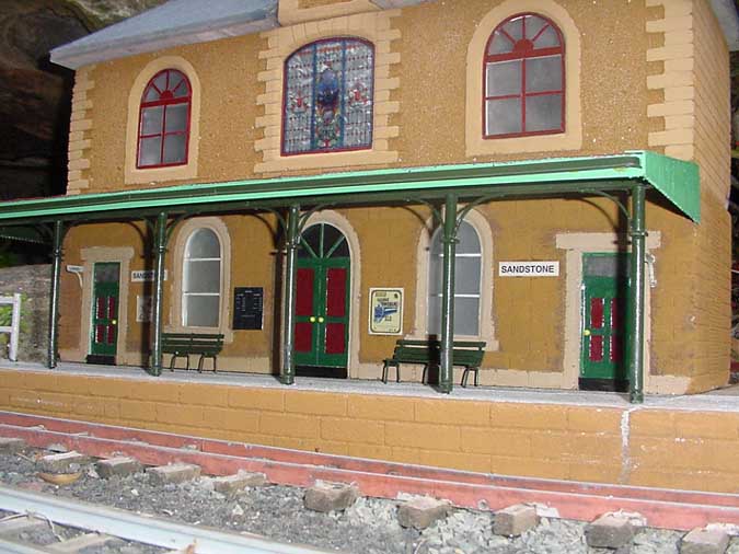 As Sandstone is the headquarters of the S&TR, it is an imposing, 2-storey structure. It is made from Hebel concrete, scribed to represent sandstone blocks and is complete with a clock tower with working clock. The roof is fibro (fibre cement sheet) scribed to represent slate, with ridge capping bent from aluminium (cans). The corrugated iron on the awning is from Al cans and a paper corrugator.
