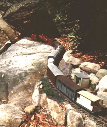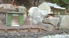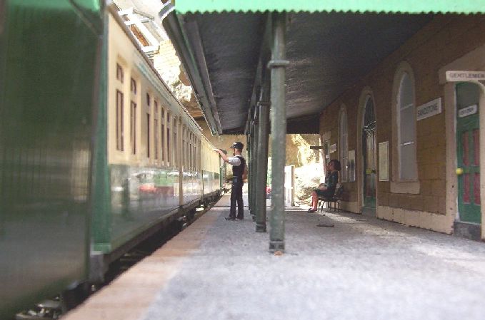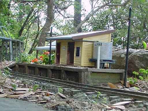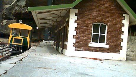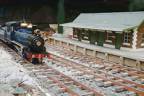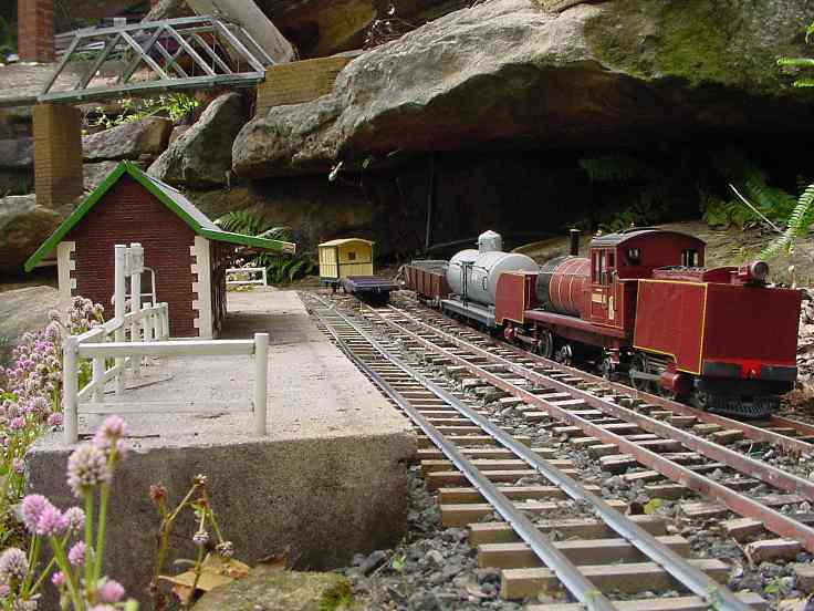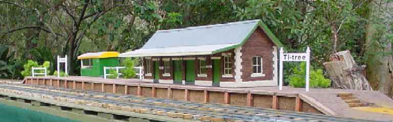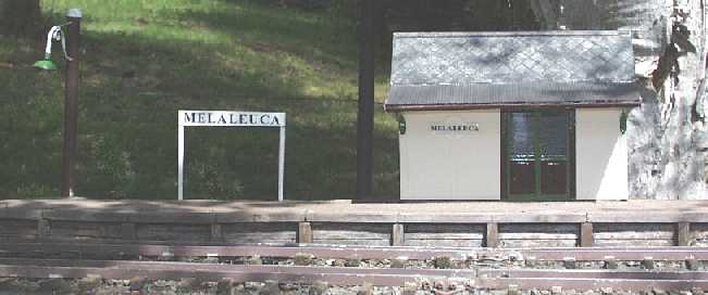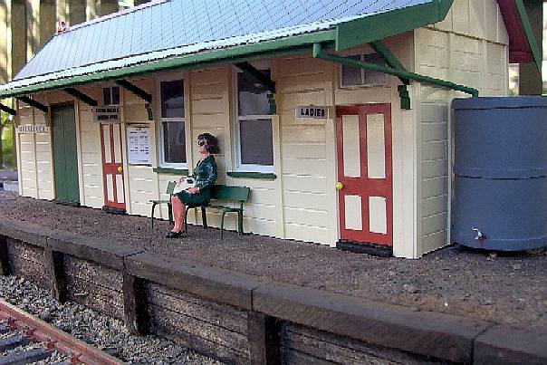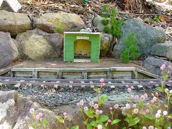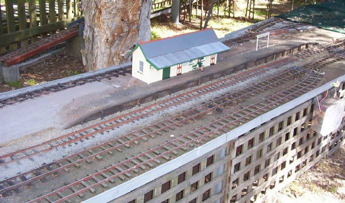 (4) Melaleuca station is built on a raised baseboard. Originally it was a small passing station with a small waiting room (left). Now (2005) it has grown to a major station with a larger building. It is the most accessible part of the layout and the place of choice for visitors to put their trains on the line.