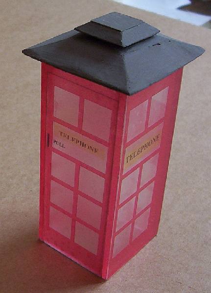 I wanted an old style red telephone box, but it seemed a lot of work to cut out all those windows. So I made a perspex 'box' (left), then drew up the 4 sides using Word Draw, and had it printed at my local print shop, onto adhesive plastic sheet. Then stuck the prints onto the perspex. The colours are a bit 'weak, but not bad.