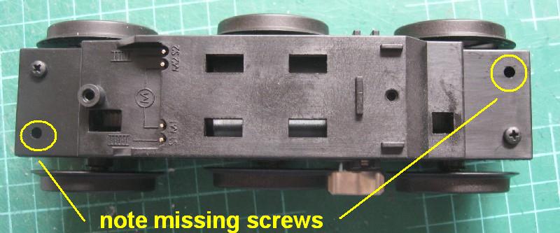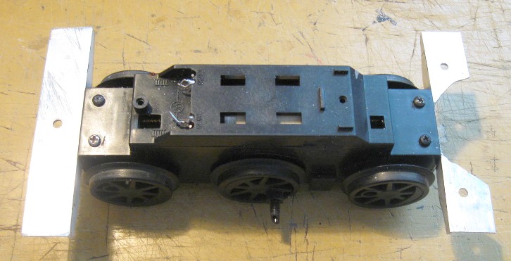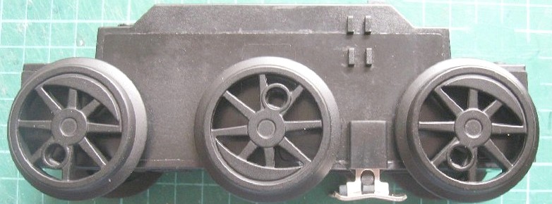 At least it's easy to pull apart. I took the wheel pickups and skates off. The two outer axles are driven, and the centre axle wheels are flanged but have about 5mm side play. Connecting rods not supplied and I'm not sure how I'll allow for the side play.