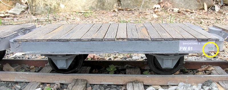 The floors are paddle pop sticks, finished with black boot polish. Note that my wagon numbers now include a weight - see yellow circle. (Soon I'll be 'rating' all my locos to pull certain tonnages and each wagon will have a mass shown. More on this later.......)