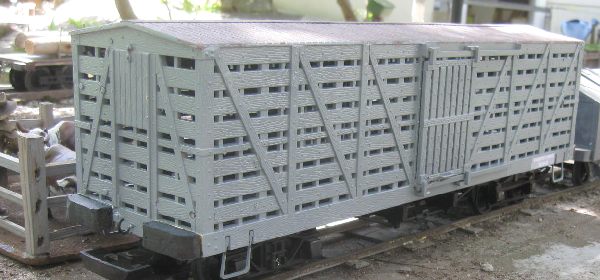 Bryan Coppock gave me a yellow (yuk!) Bachmann, Union Pacific cattle car. To make it more Australian, I removed the roof catwalk and all the ladders (and filled all the holes), removed the signs. I covered the holes in the roof with styrene strips and gave it a paint with grey primer.