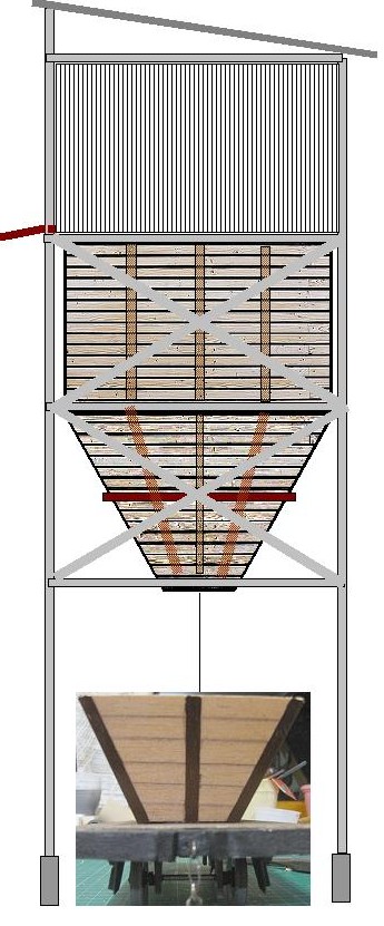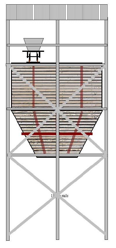 A rainy day so I started building a gravel/coal loader to go over the track at Maple Jn. The feeder at the top MAY be a small cable hauled hopper on HO track. It's about 200mm long, 180 wide and 500mm high. Here's what it will look like: