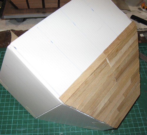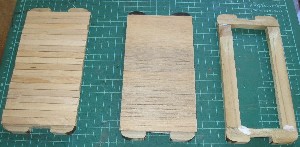 I cut the hopper from corrugated plastic sign material, folded it and held with masking tape. Then I'll cover it with paddle pop sticks glued on with Fuller's Ultra Clear. The main framing will be timber strips.
