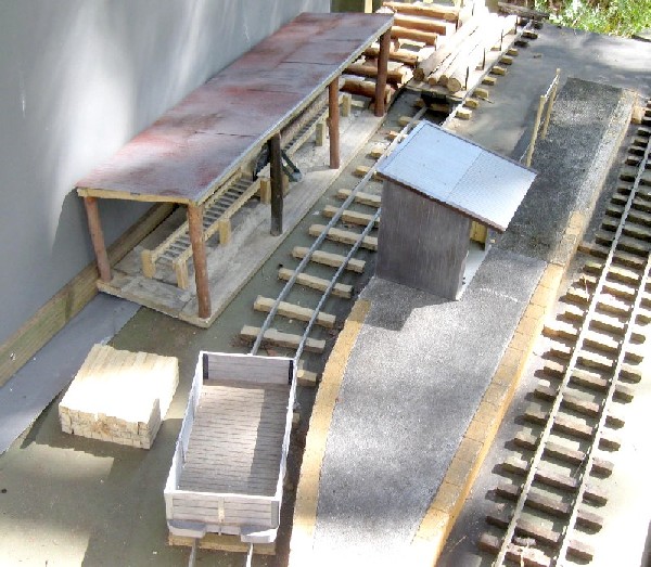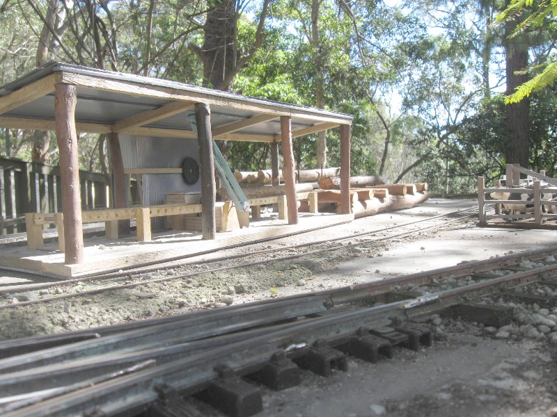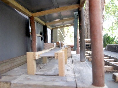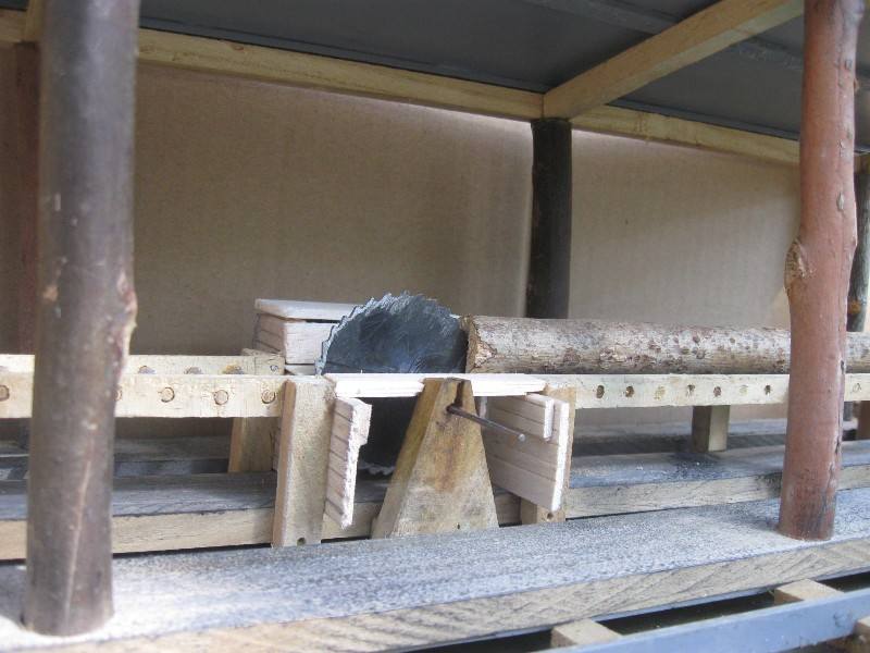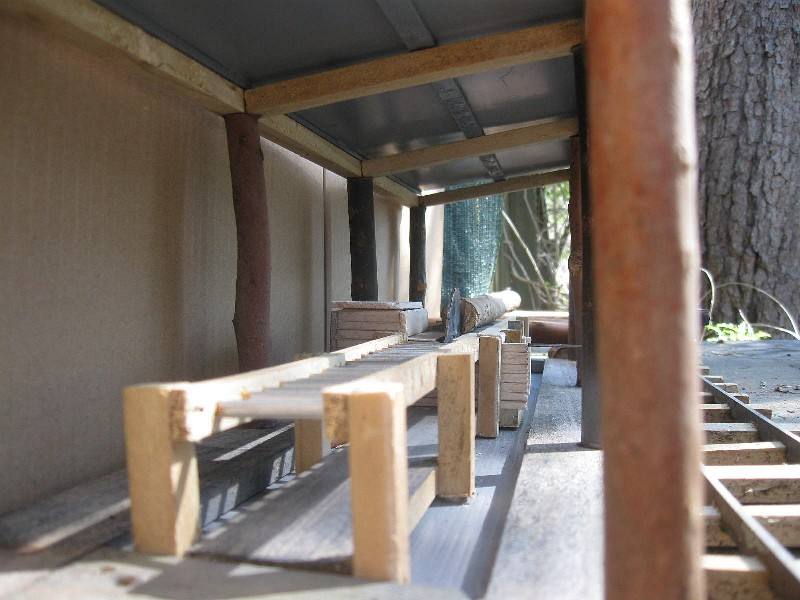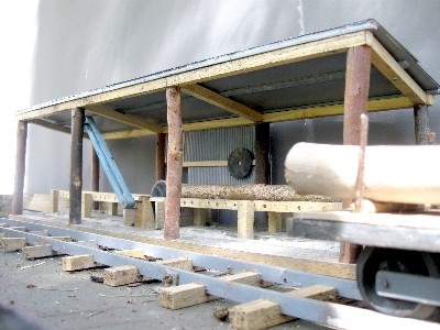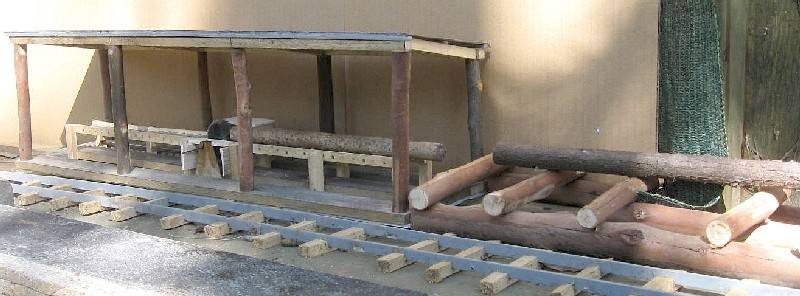 I've started building a small sawmill. It will probably go at Oleander siding (along the fence). So can only be 150mm wide, but 1.8m long. I raided my barbecue wood pile for some timber and made most of the shed and log stage from bits of gum tree. The roof is corrugated plastic sheet.