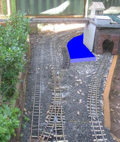 Also, some progress on the new Hebel retaining wall across the old Maple Jn site. The new track is made but more fill is needed. The new grade is 1:45 compared to the old 1:30 on a 900mm radius curve.