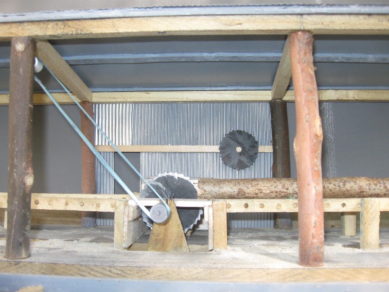 Here's the progress so far. Logs get offloaded from the train at right end to a rough log 'stage'. Then into the mill on rollers. The saw will turn - there's an electric motor behind the blade. Hopefully it will also drive a (dummy) shaft and steam piston and flywheel. It will have sound. But that's later. At the left end the sawn timber will be loaded back onto rail. This bit not started yet.