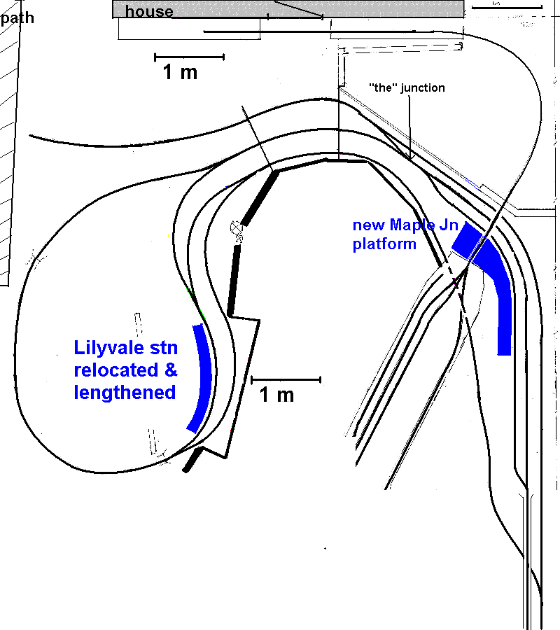 I've changed my mind (again) about the layout at Maple Jn. Originally I had allowed for an island platform, but I decided I didn't like the look of the track, so now I've relaid the track with 2 parallel lines and will have a single platform - shown blue.