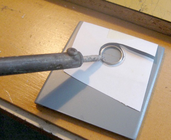 The front headlight is a keyring melted into the styrene. The paper surround is to protect the styrene when I slip with the soldering iron! Two 5mm white LEDs will be inside the circle.