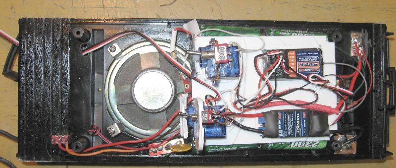 The speed control is standard Hobbyking 2.4GHz - left end of pic. The motor has a series resistor added to give a more variable speed as the train hits grades or curves. This also allows the sound system to calculate the motor current and give a better speed signal to the chuff rate, so that the chuffing starts exactly when the loco starts to move. It has 2 levels of volume selected by the left stick of the Tx.