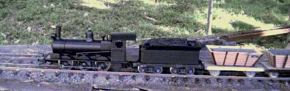 (5) The fifth loco is based on a Bachmann 4-6-0 but converted to an 0-6-0 to look like a NSW 19 class . I decided that it was too hard to move the centre axle to give the characteristic 19 class unequal wheel spacings, but the discrepaancy is not too noticeable. I was able to get that other great look of the 19 class where you can see daylight beneath the boiler. I like the uncluttered look of the early 19s so I haven't put much detail on the boiler - not even a compressor. The boiler is 50mm ID plastic drain pipe (as used under the bathroom sink); the footplate is 3mm steel and the rest is styrene sheet. The dome is turned from wood and the funnel from electrical conduit. The tender is the Bachmann unit reduced in length and width (cut in half and re-melted together using a soldering iron), and the headlight is a shortened Bachmann. Handrails are steel wire, heated with a soldering iron and melted into the plastic. The whistle and turbo generator are the Bachmann ones, and the safety valve is from styrene and wire coil. It is painted with flat black.