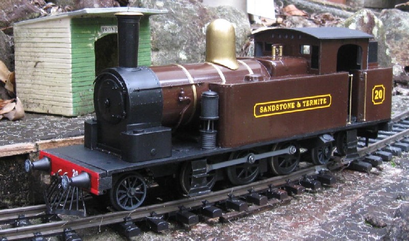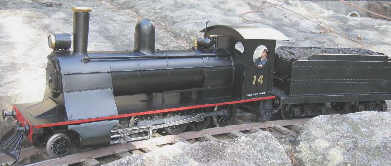 (9) based on an Aristocraft 0-8-0 motor block. The body is based on a South Maitland Railway 10 class. It is battery powered with 2.4 Ah, 12V NiMH batterries in the tanks and RC in the boiler. A 50mm speaker is in the bunker facing into the cab.