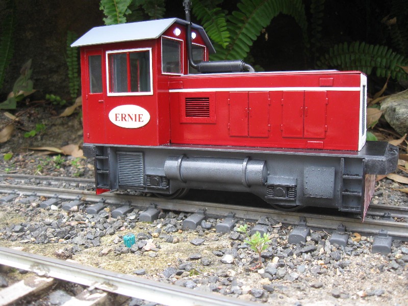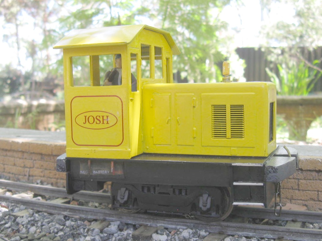 (17) Grandson #2, Ernie originally had the loco now called Josh, but he didn't like the yellow colour! So I built a bigger diesel with RC and "the works". It has 8 NiMH cells, 433 MHz RC and full sound. Made from styrene on an Aristo L'il Critter motor block (ART 29351)