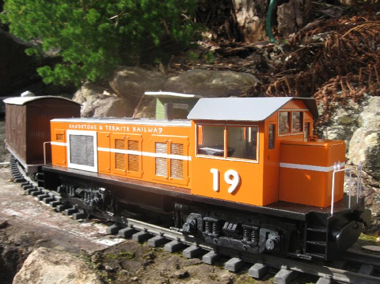 (8) The S&TR's first diesel loco, based on Aristocraft L'il Critter and vaguely resembling a NSWGR X200 rail tractor. It is still track powered and has a sound system based on a PICAXE controller, with a 3" speaker in the cab and 8 NiCd cells in one hood.