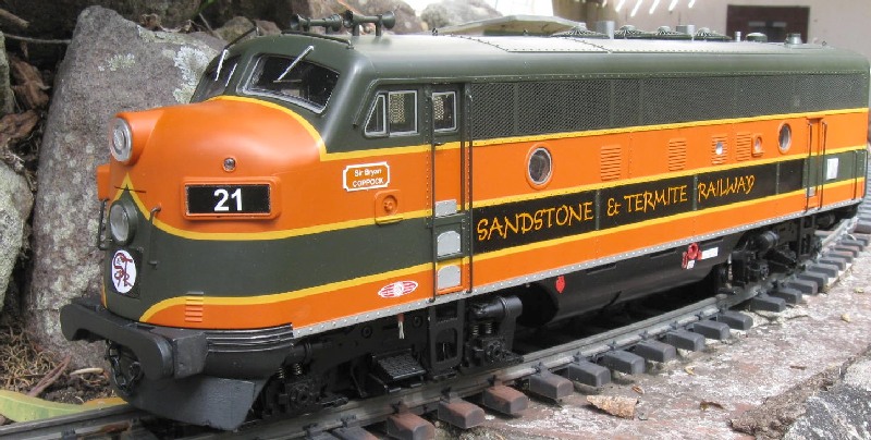 (21) A pretty well unmodified USA Trains FA unit. I removed one motor block and ripped out all the wiring. It has 2.4GHZ RC with a LiPo battery and additional electronics to ensure the diesel rev sound builds up before the loco accelerates.