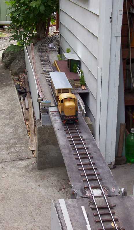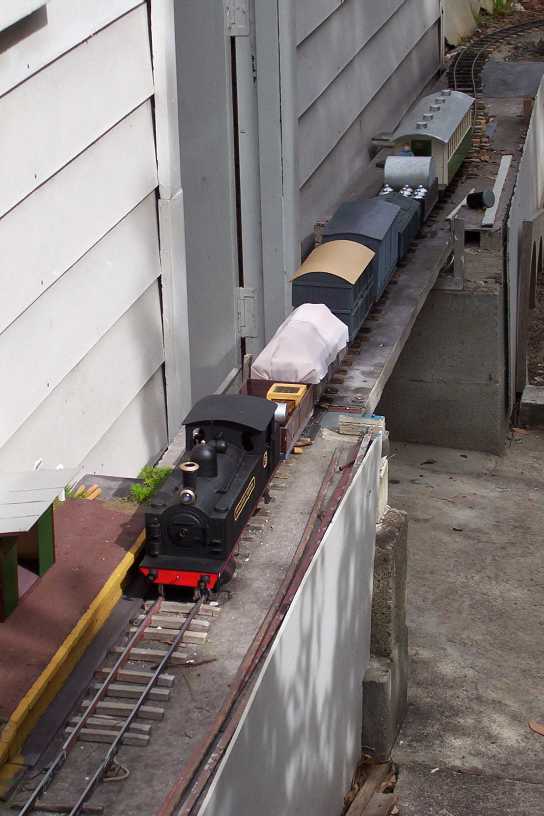 This section is just a fibro baseboard across the front of my workshop. It includes a lifting bridge across the door to the workshop and Termite. There is a small wayside platform, which the diesel is just departing, for Melaleuca.