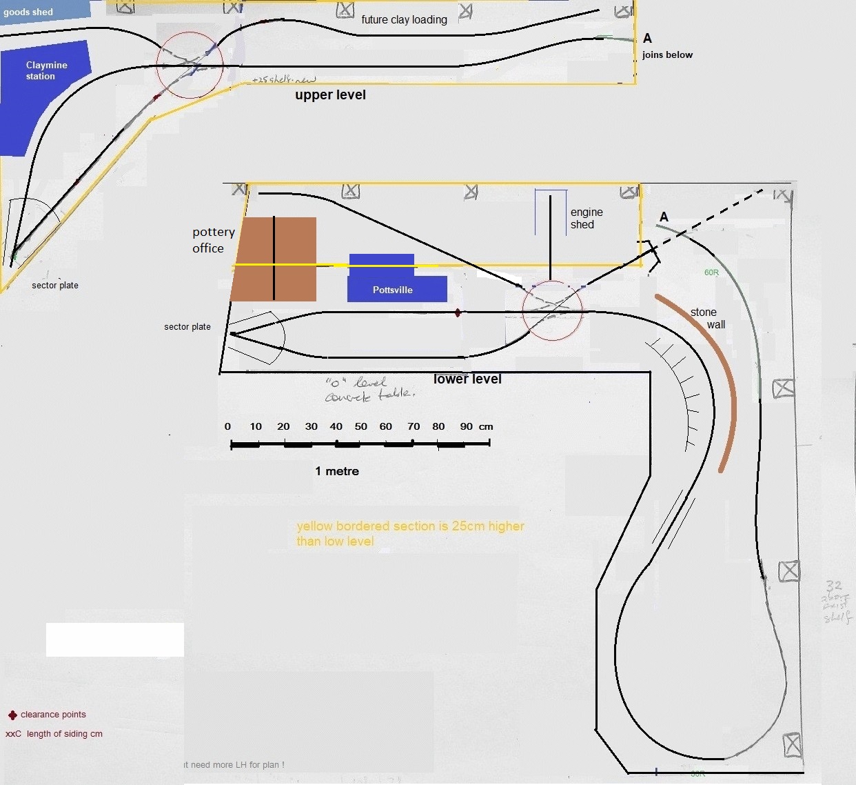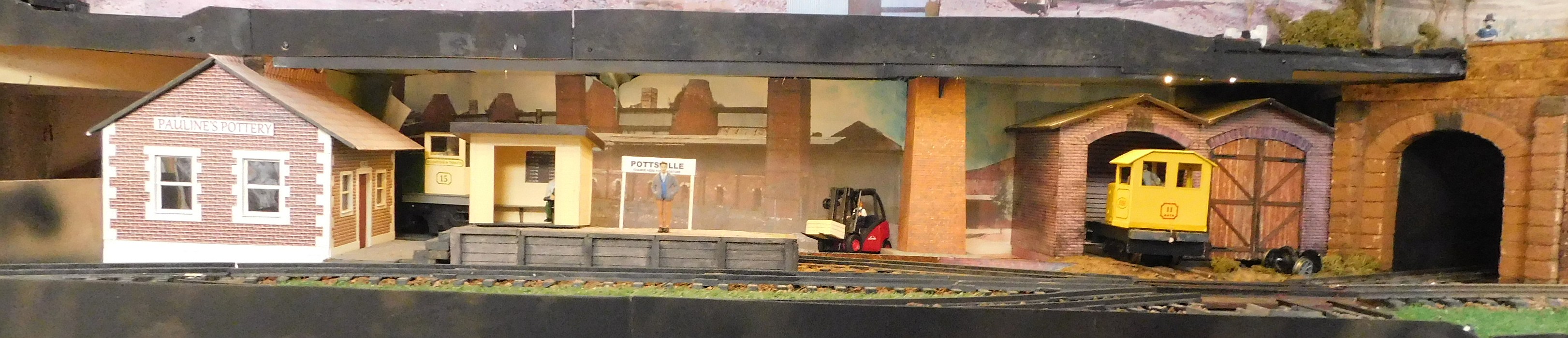 Pottsville station area on lower level, Claymine yard above. Pottsville has a building for Pauline's Pottery and the backscene represents the brickworks that uses the lower grade clay.