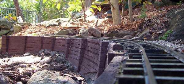 Leaving the cutting, there is a retaining wall as we turn down the side of the yard behind the garden sheds.