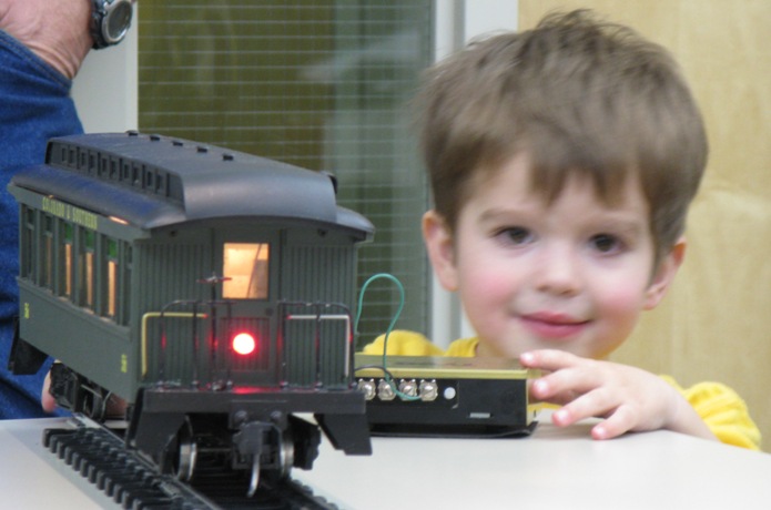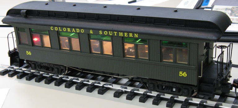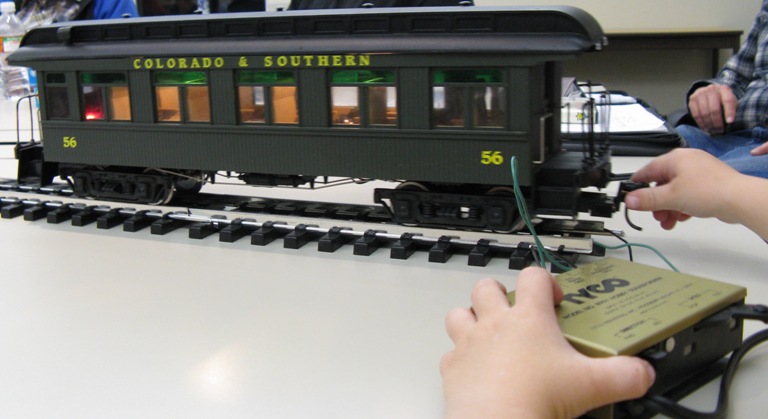 | Ezekiel applies power to Devin's Delton G Gauge Colorado & Southern Coach #56. |