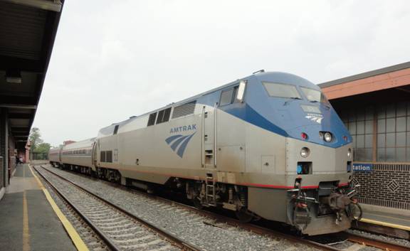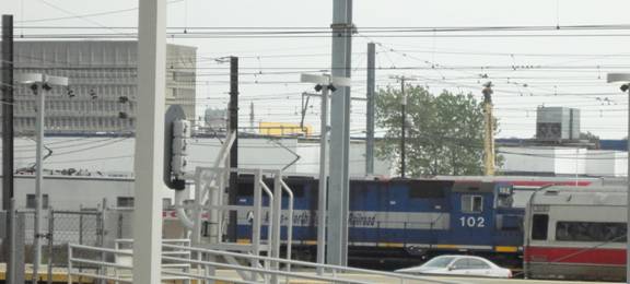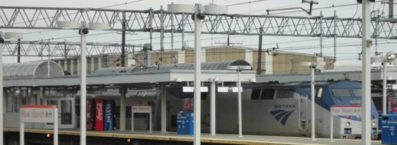 I then retrieved my suitcase and went into the station. I saw an Amtrak train which turned out to be a Shuttle train consisting of P42 #63, an Amfleet 1 coach, and a former Metroliner cab car. I photographed the train.