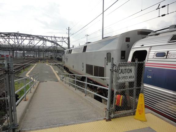 I watched as P42 #9 was uncoupled and replaced with two AEM7s. I filmed the AEM7s being coupled to the train. I then filmed P42 106 reversing through the station before I got back on the train.