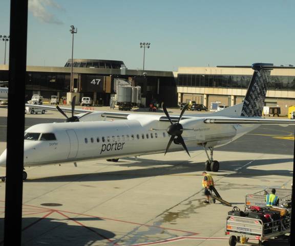 We made a shaky landing. As we landed, I filmed the landing. We got off the runway at the last possible exit and taxied to the terminal. As we taxied, I photographed the terminal with a Porter and an Air Canada Bombardier Q400.