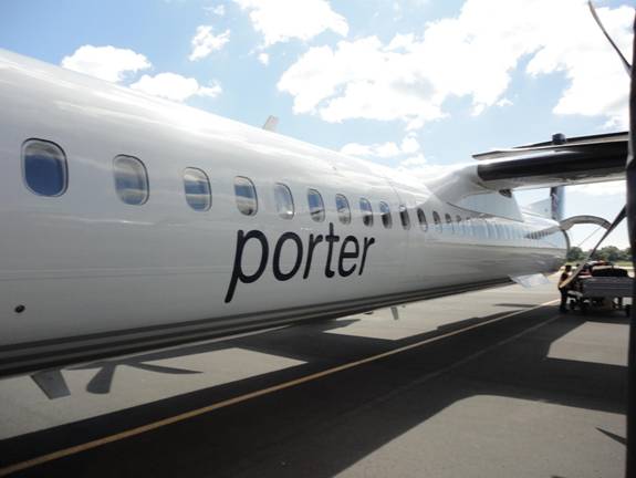 Boarding began a few minutes later. Porter's planes all have leather seats and I was seated in the fifth row from the front of the plane. From the plane, I photographed another Porter Bombardier Q400.