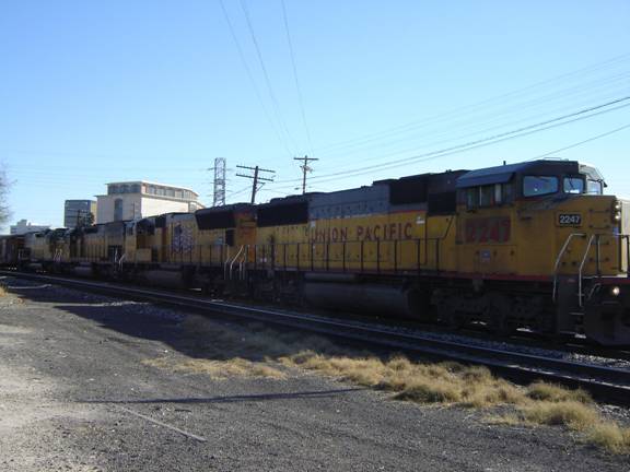 After I left the gas station, I walked a few blocks to the Union Pacific main line. I was hoping to see a train. Eventually, a westbound freight passed by. There were four diesels on the head end, including two former Southern Pacific tunnel motors that had been repainted into the Union Pacific livery.
