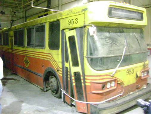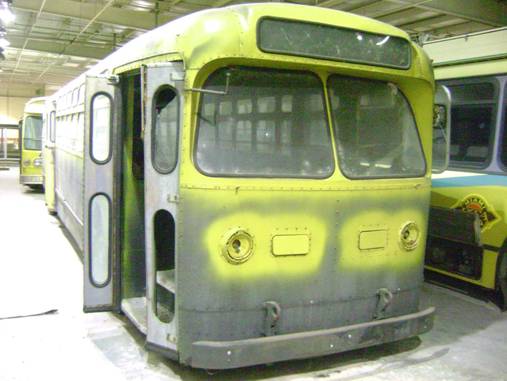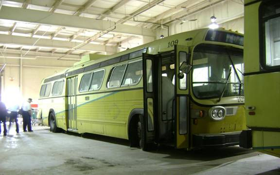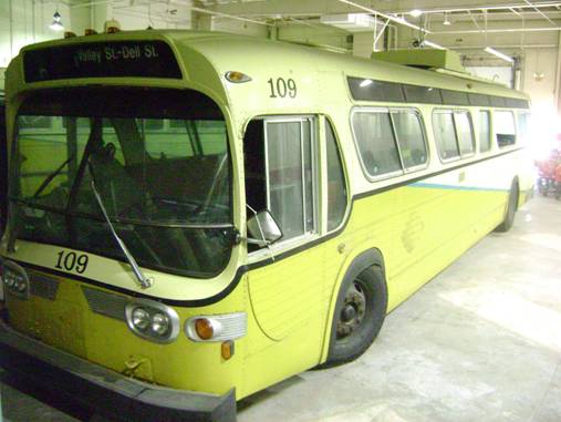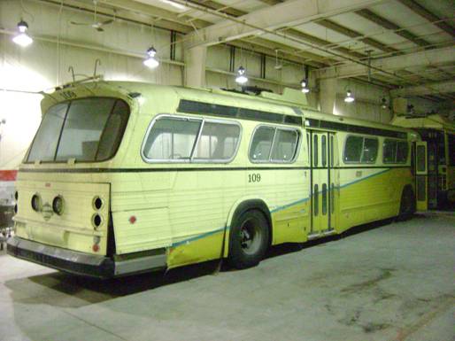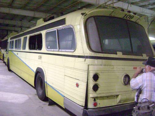 Adjacent to the Northwest hub is the building where RTA keeps their historical fleet. This is where 110 had been stored for the past nine years. We were allowed inside the building. The first bus I saw was BBC #109 which was missing various parts and in sad shape.