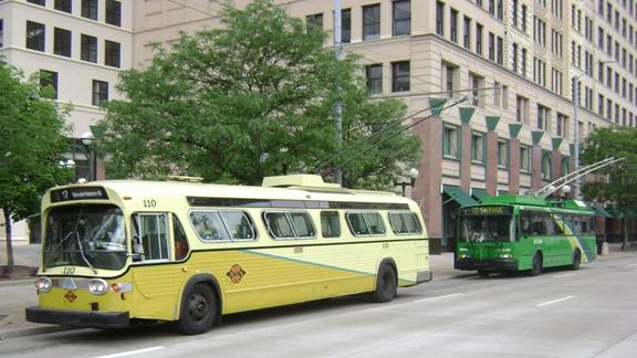 Everyone soon boarded 110 and we left. Before we left, we saw a Skoda being moved under battery power within the garage. Someone else pointed out 9-10 year old graffiti carved into the window! As we drove, we got lots of stares from bus drivers and people on the street. At various points on the charter, we explained to people about the trolleybus. 110 is 15 years older than anything else RTA has active!