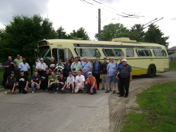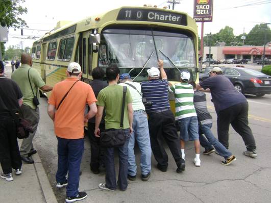 Moments later, a maroon Chevy Caprice pulled over and the two occupants got out. They were curious as to what was happening and wanted to be in the group photo. We let them even though they weren’t on the charter. They soon left. We boarded 110 and departed a couple minutes later.