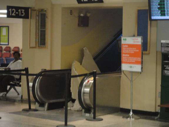 I then lined up to board the train. On the way, I noted the Ontario Northland ticket counter had the Ontario Northland signage removed. The Northlander had made its last less than a week earlier. I noticed a pile of debris by an escalator. I knew Union Station was undergoing renovations, but I overheard some say it had just happened. The amount of debris would have certainly injured someone if it had fallen on them. I photographed the debris.