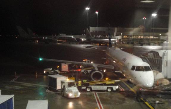 I worked on this report some more. I saw my flight was delayed by 35 minutes. I had a 10 minute massage at a place in the terminal. After my massage, I photographed the plane I would be flying on.