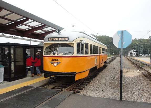 Someone asked if I was going photography. I said only transit photography. During the ride, I spoke with someone whose son was an avid railfan. When we got to Mattapan, I photographed PCC #3260 and filmed it going around the loop.