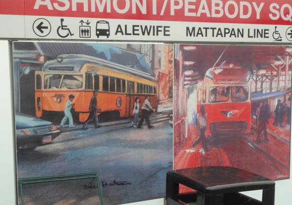 I then filmed the car when it departed Ashmont. I then photographed a mural in the station depicting the Mattapan PCCs.