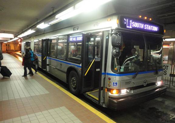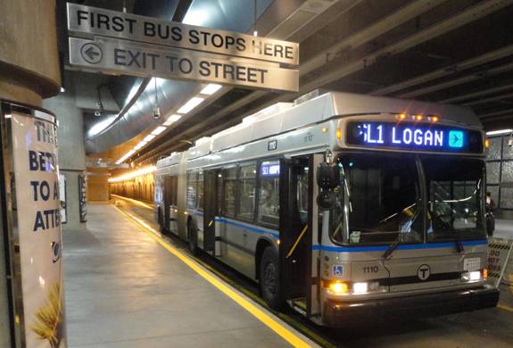 I then went to the baggage claim and retrieved my suitcase. I then bought an MBTA seven day pass worth $18 and caught a Silver Line bus to South Station. I noticed the Silver Line buses were now unloading passengers on the street across from the station. I photographed the bus after I got off.