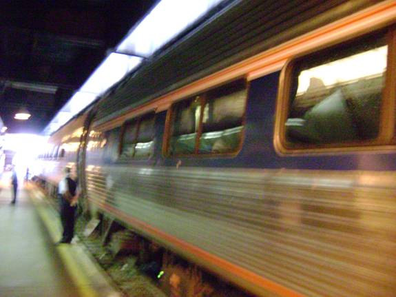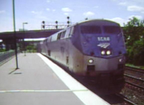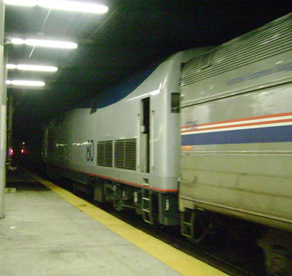 The train stopped at Pittsfield. The stop was quick and we were soon off. The sun went down as we approached Springfield, our next stop. I saw some fireworks at Springfield for the 4th of July. At Springfield, I saw a couple Amtrak shuttle trains and the Vermonter. We were originally to have a smoking stop in Springfield, but because we were late, the crew made it a non-smoking stop. We were soon off again.