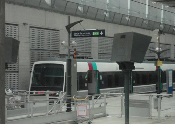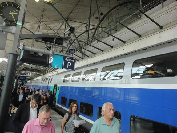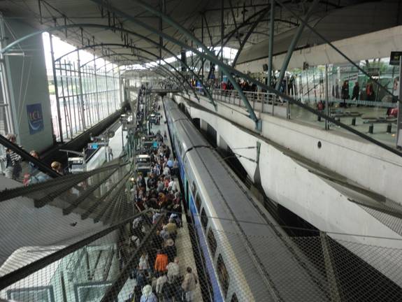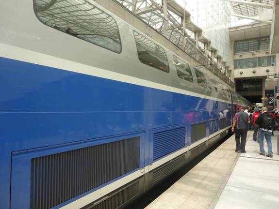 The train I was taking was a bi-level TGV. I boarded the train in the second class car and sat down. I noticed the coach was a little hot. While I was waiting for the train to depart, I photographed a commuter train that would take people into downtown Paris.
