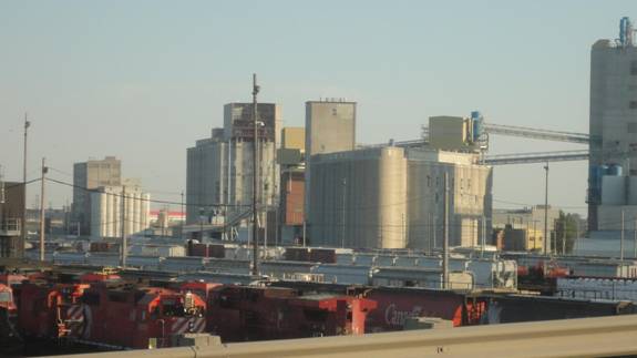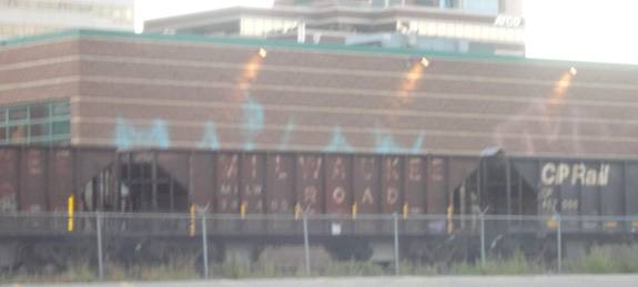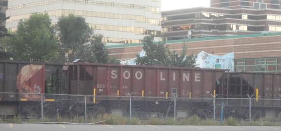 I then walked two blocks south. I saw some ballast hoppers. At first, I thought they were on the derailed train, but that wasn't the case. However, some of the ballast hoppers were lettered for the SOO Line and the Milwaukee Road! Needless to say, I photographed them.
