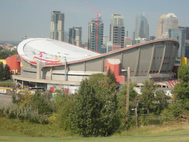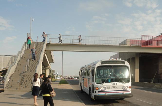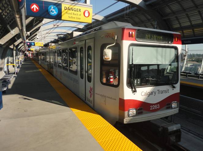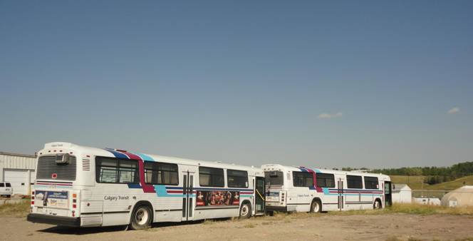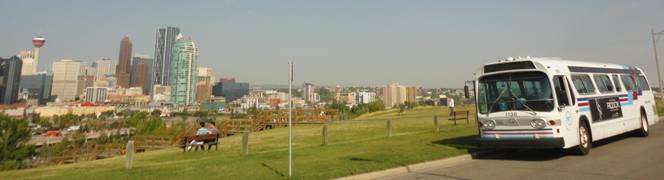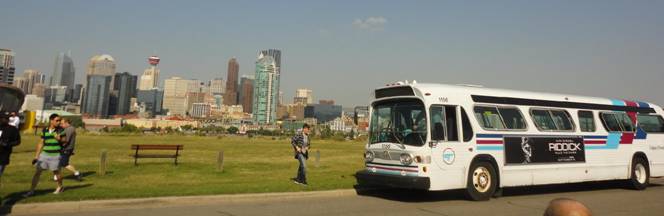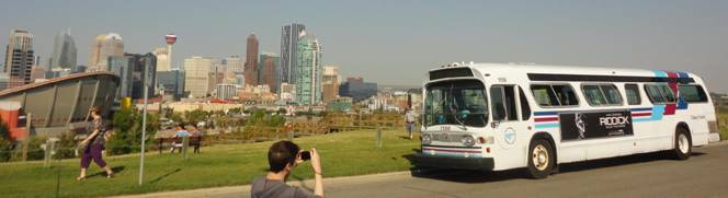 We got back on and headed out. We drove on a really bumpy road near the Calgary Zoo. Some people on the charter joked that the rear end of the bus would fall off! Our second photo stop was near Sultana C-Train station. We posed the bus with the elevated section in the background and waited for the first train to pass.