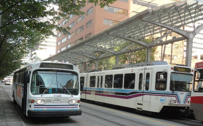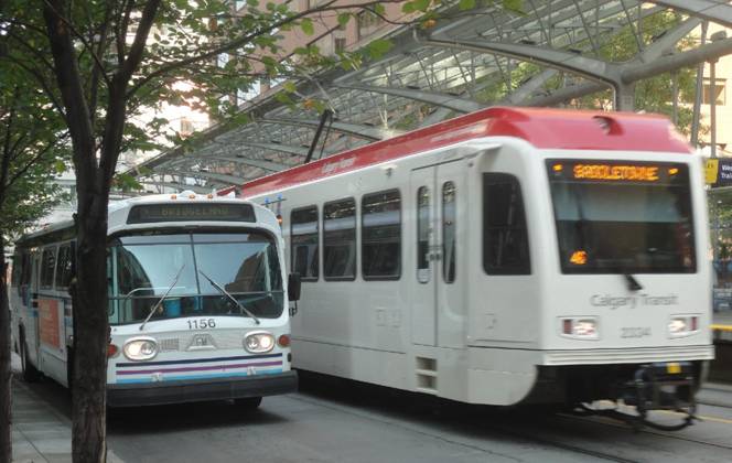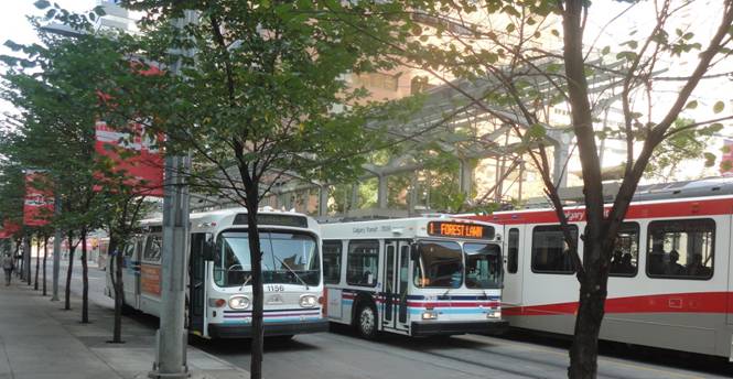 Next, we stopped on 7th Avenue and photographed #1156 with service buses and C-Trains.